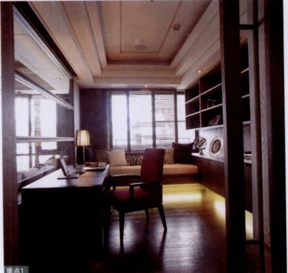 將緊臨客廳的房間規(guī)劃成書房,并以玻璃與客廳區(qū)隔。書房角落臨窗規(guī)劃了懸空觀景沙發(fā)座,并設(shè)計(jì)下藏式燈光,讓書架同時(shí)也是展示空間。