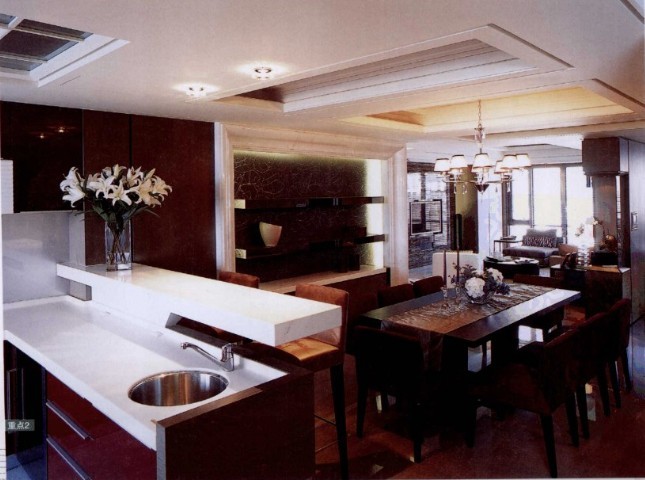 連接廚房、餐廳及客廳做開放式的設(shè)計(jì),并運(yùn)用鏡面做空間感的延伸,讓空間更顯大氣,餐柜下面是隱藏式收納柜,上面特意設(shè)計(jì)層板用來(lái)擺放業(yè)主的收藏。