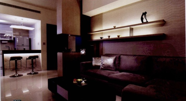 以深色仿鱷魚皮壁紙包覆玄關柜,并延伸至沙發(fā)主墻。特別設計的層板不只作為裝飾,同時也是收藏品的展示空間,再打上燈光,產(chǎn)生了意想不到的效果。