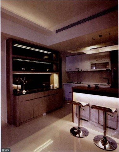 燈光運用是創(chuàng)造空間層次感的關鍵,特別是由下往上打的間接燈光,能夠營造氣氛。吧臺與餐邊柜的間接燈光,成為營造生活氛圍的最佳幫手。