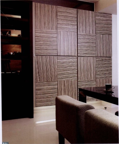 柜子本身就是空間最好的裝飾,木質墻面同時具備了主墻的裝飾效果,餐桌對面的收納柜,運用了不對紋路的8片門與十字溝縫處理,營造了柜體的另一種風格。