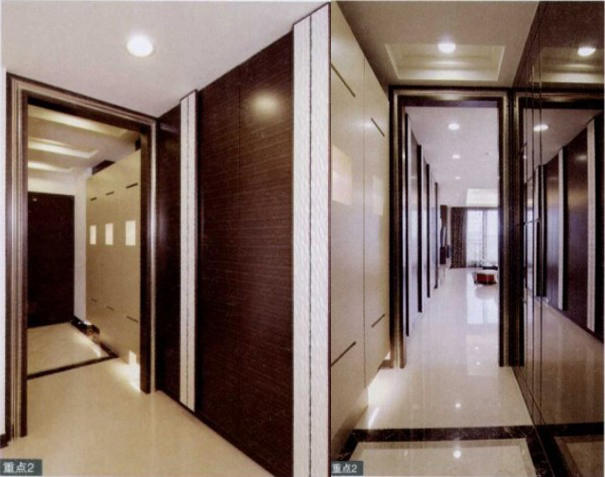 從玄關(guān)到電視墻看似普通的墻壁,其實(shí)在內(nèi)里藏了收納柜,整齊且有秩序的門片延伸了空間,而局部的展示空間讓收藏品成為視覺焦點(diǎn)。電視墻特別以不同大理石相互襯托,并以大塊面積強(qiáng)氣勢(shì)。
