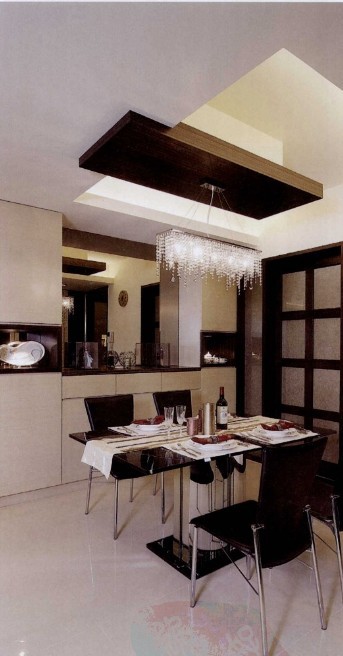 餐廳里,主墻正中央使用茶色鏡帶來(lái)反射效果,下方為收納柜體,兩旁的空間可以讓業(yè)主視需要展示收藏品。餐廳里的依著簡(jiǎn)潔的布置手法,并不單一,餐桌上方的水晶燈可以讓空間增添一份淋漓的美感,迎合著茶色玻璃的反光,讓空間更具美感。