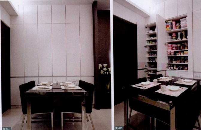 本案業(yè)主家的女主人是個非常高要求的人,對于家的“整齊”度有極高的要求,打定主意要配置深色皮質(zhì)沙發(fā),在空間不雜亂的前提下,設(shè)計師為其打造了一個絕對整齊的居家。為節(jié)省預算,設(shè)計師選擇用定制收納柜搭配木作門片并以完全嵌入式的設(shè)計,讓墻面更加清爽,也讓焦點回到以石材打造的電視主墻。開門見樓梯及見灶的問題,則在設(shè)計師的創(chuàng)意設(shè)計下,以拉門及隔屏改變視覺動線,得以化解,同時也保有空間的開闊感。