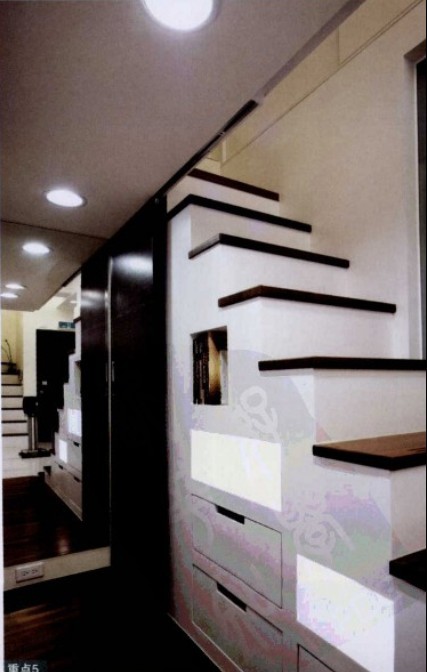 通往女兒房的樓梯側邊規(guī)劃收納抽屜以及陳列架,以收納物品,其也可作為衛(wèi)浴用品的收納柜。