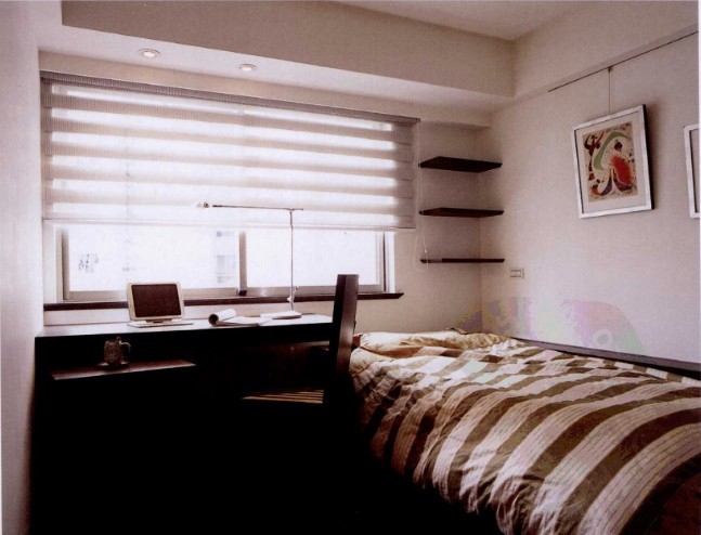 小孩房最重要的收納在閱讀區(qū),除了書本的收納外,電腦主機的收納也很重要。將室內(nèi)采光最好的一面規(guī)劃了書桌,并在其下方設計了電腦主機收納柜,同時在墻角規(guī)劃展示層架。