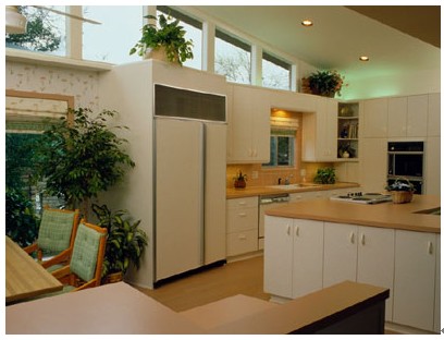 至于吊柜寬度,在同一個(gè)廚房?jī)?nèi),最好采用300毫米及350毫米兩種尺寸(一邊墻一種寬度),才能置放大型碗碟。家庭主婦站立時(shí),應(yīng)垂手可開(kāi)柜門(mén),舉手可伸到吊柜第一格,在這600-1830毫米之間的水平空間中,放置常用物品,操作方便。