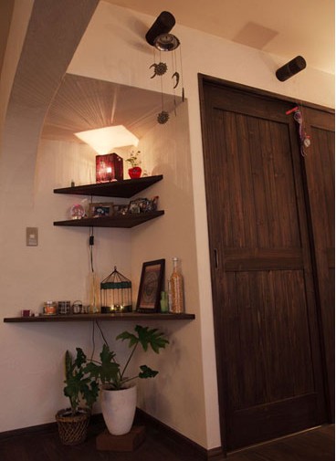 利用墻壁的凹凸度,用木板將墻角打造成多層的開始放儲物格。既與開放式的主題空間相符,又增加了空間的實用度。隔板的大小可以任意選擇,從下至上漸小的樣式,讓角落變得梯度感十足。高處掛上旅游時買來的民族特色風鈴,空間的裝飾元素變得多元化。擺放些可愛的小玩意兒,瞬間裝扮出一個可愛有趣的小角落。最下方可以選擇一兩顆體積適合的綠植,裝扮空間又凈化空氣。
