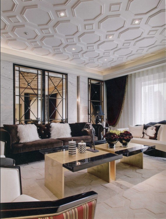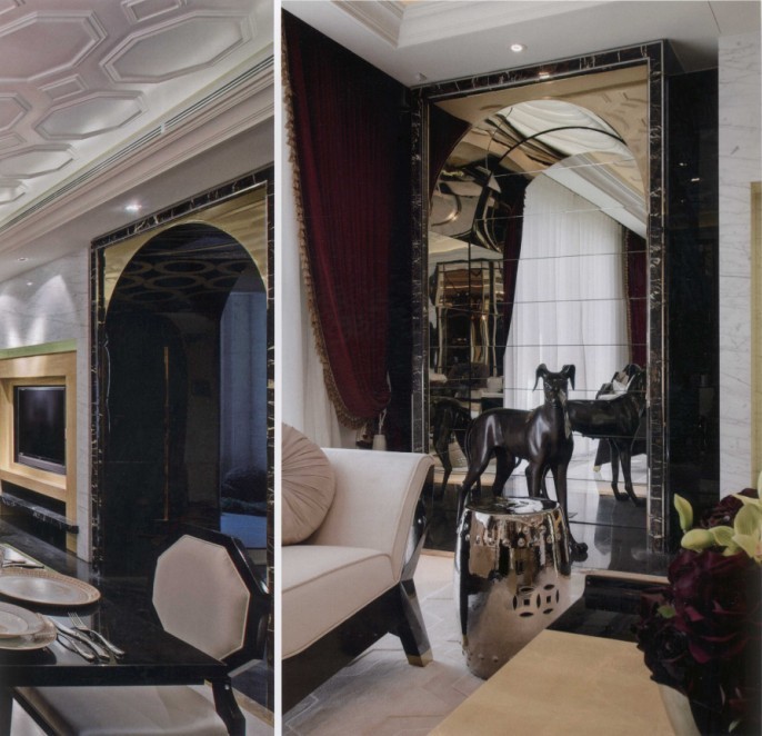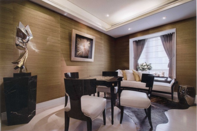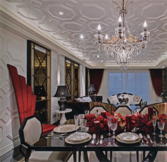 六角形的浮雕效果天花,繼續(xù)延伸到餐廳主墻,強(qiáng)調(diào)立體而別具個(gè)性的空間感。新古典優(yōu)雅而繁復(fù)的桌椅造型,強(qiáng)調(diào)質(zhì)感而非雕梁畫(huà)棟的裝飾家飾,反而更凸顯了整體空間的奢華感。