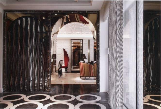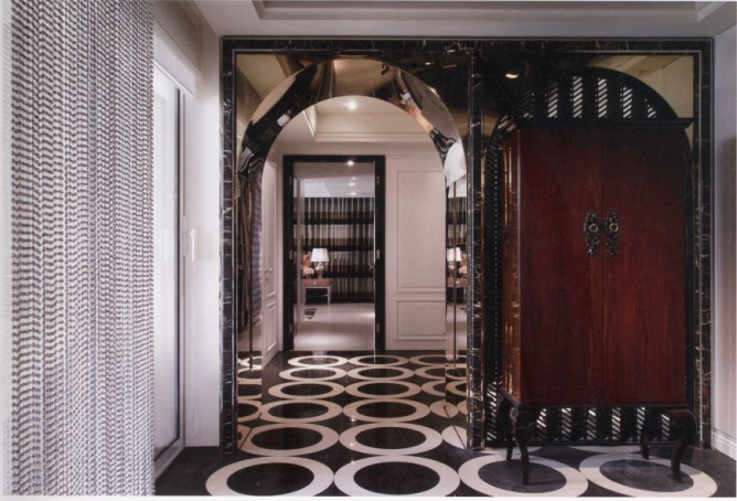 黑底白圈的地坪延伸到起居室。不銹鋼鏡面的傘狀天花,左右對(duì)稱(chēng)的黑金花、金色鍍鈦板拱型穿廊和窗花,使軸線變得方正,也讓玄關(guān)形成正式的迎賓空間。