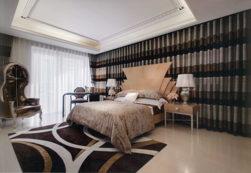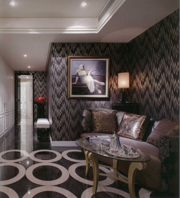 金、銀、白、紫等帶有金屬光澤質(zhì)感的色彩,畫(huà)框裱步、編織壁紙、拼花黑檀墻面、銀箔造型電視墻、玻璃馬賽克、貼飾孔雀壁紙……本戶私密空間中,大膽運(yùn)用多元且綺麗的材質(zhì),堪稱(chēng)“風(fēng)華園”中豪門(mén)風(fēng)格的代表作。同時(shí),也將裝飾裝修的藝術(shù)美學(xué),發(fā)展得淋漓盡致,令人震撼而驚艷。