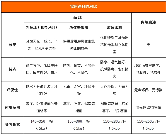 通過對各種常用涂料的效果、特點(diǎn)、環(huán)保性、價(jià)格等對比,業(yè)主們可以根據(jù)自己的實(shí)際情況來挑選適合自己的涂料。