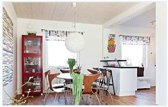與客廳毗鄰的餐廚區(qū),空間色調有了明顯的變化,無論是墻面裝飾、家具,還是布藝軟裝都呈現(xiàn)出活潑感,豐富的色彩不禁讓人食欲大開。