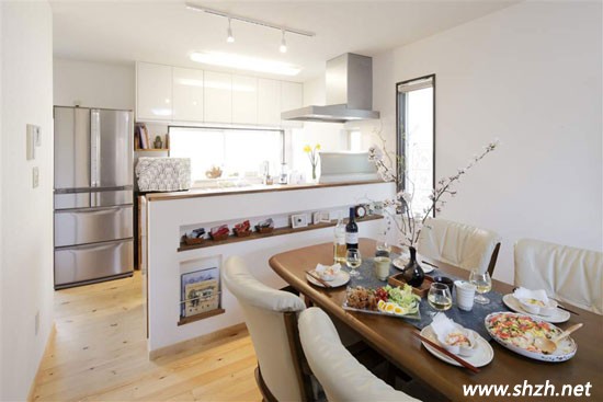 這里是開放是的廚房及用餐區(qū)域,對(duì)于小戶型是節(jié)約空間的最好的方法,白色和淡褐色的顏色為主色調(diào),讓我們能夠放松心情。褐色木質(zhì)的長(zhǎng)桌,搭配白色皮質(zhì)的椅子,餐桌上的一株梅花,淡淡的粉色,更飄散出甜美之感,并且深藍(lán)色的桌簾,白色的小點(diǎn)點(diǎn)點(diǎn)綴,猶如一片星空,浪漫溫馨。將簡(jiǎn)約的田園氣息及歐式風(fēng)格浪漫風(fēng)情表現(xiàn)的淋淋盡致。