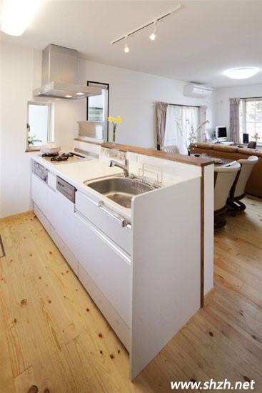 我們可以很清楚的看到櫥柜選擇的是白色加褐色的櫥邊,盡顯廚房的干凈整潔及與客廳的和諧。金屬的水池,易于打掃的同時(shí),也給白色的臺(tái)面增添了純自然的色彩。金屬材質(zhì)的支架靠近水池,將洗干凈的碗盤放在里面,不僅可以讓餐具的水再流回水池,而且可以避免手滑摔碎餐具,一舉兩得。