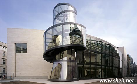 從上圖看德國(guó)歷史博物館與天空的距離很近,幾乎快要接觸的感覺(jué)。我們可以很清楚的看到螺旋式樓梯的玻璃中心柱蜿蜒在三個(gè)樓層之間,看上去就像是一個(gè)透明的蝸牛殼,透過(guò)玻璃,我們可以看到里面有比較簡(jiǎn)單的裝修設(shè)計(jì)與裝修擺設(shè)。在每一個(gè)樓層,走廊就像露臺(tái)一樣伸進(jìn)雄偉的玻璃大廳,每一個(gè)玻璃大廳的圓頂以巨大的弧形凸出,在平時(shí)一般被遮擋住的大樓的整個(gè)邊上形成了拱形。螺旋的樓梯旁邊的博物館就像一個(gè)巨大的玻璃柜,他們是由玻璃、鋼筋與砂石組成的吸引觀眾的磁鐵--這也是德國(guó)第一個(gè)貝聿銘作品。貝聿銘,這位“光線魔術(shù)師”,在巴黎為盧浮宮建造了玻璃金字塔,在華盛頓為國(guó)家美術(shù)館設(shè)計(jì)了引起轟動(dòng)的東館。