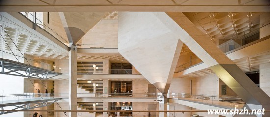 博物館內(nèi)的設(shè)計也是比較繁雜的,進(jìn)入館內(nèi)抬頭向上看,各種不規(guī)則的室內(nèi)裝修設(shè)計風(fēng)格,給館內(nèi)增加了幾分韻味。此次的設(shè)計讓貝聿銘在這個國家考察了幾個月們最后依據(jù)埃及,突尼斯等地風(fēng)格特色綜合起來設(shè)計的。室內(nèi)的金色的墻壁是采用當(dāng)?shù)氐牟A粔磉M(jìn)行裝飾的,體呈現(xiàn)出了整個館內(nèi)的大氣。