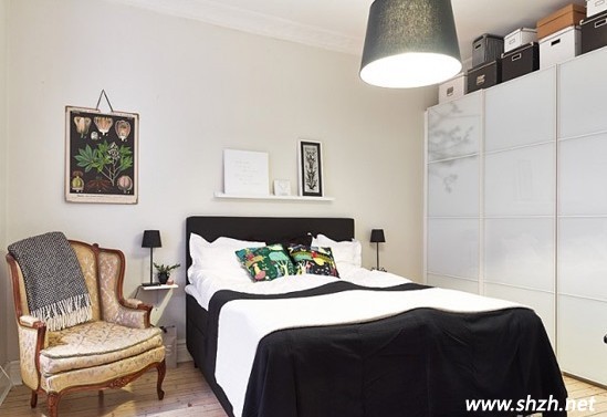 床頭墻壁上的水粉風景裝飾畫將大自然帶進了臥室,和墻壁上擱板上擺放黑白色調的裝飾品很和諧的形成了一處風景。臥室的地板采用的是最原始色的木材地板鋪成的,我們可以看到樹木自然的紋理都被保留了下來,使我們融入了大自然的懷抱,并且仿佛還能聞到樹木散發(fā)出的清香氣味,給人舒適、清新、快樂、溫馨的感覺,臥室的這種裝飾便于提高我們的睡眠質量。白色的衣柜邊上有淡淡的樹枝暗影,很特別的設計,像是從那副風景畫上倒影過來的,給人一種身處林間,光影交錯的錯覺感。