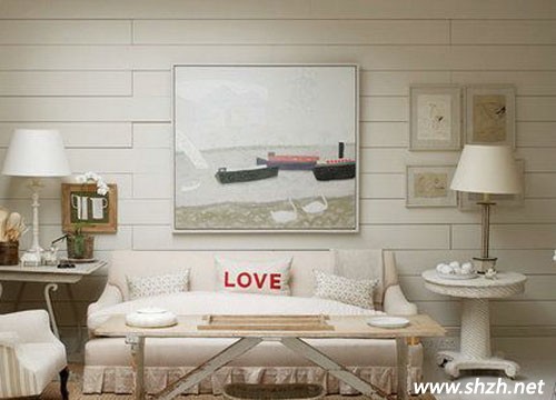 代替一整幅的壁畫(huà),用多個(gè)小相架裝飾單調(diào)的墻壁,還能展示新婚夫婦的結(jié)婚照,讓客廳縈繞著甜蜜。紅白搭配的抱枕起到隔開(kāi)大片白**塊的作用,讓房子達(dá)到冷暖平衡。