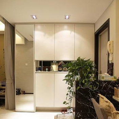 玄關(guān)儲物的設(shè)計(jì)、美觀又使用, 收納柜中間裸空了一橫,用來擺點(diǎn)小飾品和鑰匙。