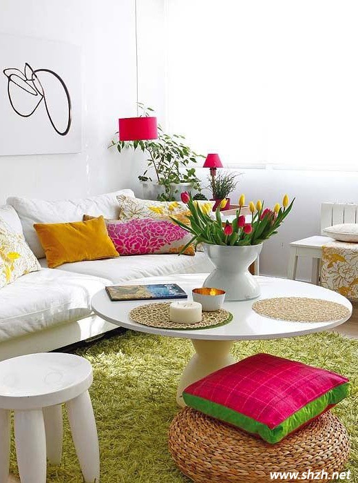 地毯的選擇,很可能也決定了這片區(qū)域的風(fēng)格走向,鮮艷的用色、地毯和家具的搭配也非常重要。創(chuàng)意的客廳空間充分顯示出與眾不同的風(fēng)格,對于略帶有鄉(xiāng)村風(fēng)格的客廳來說,這片草色的地毯是很好的選擇,純凈的茶幾和沙發(fā)下鋪有這樣一塊地毯,局部氣氛立刻強(qiáng)化出來。而草色地毯的質(zhì)感以及顏色的簡樸味道,與布藝沙發(fā)的格調(diào)非常融洽,能讓自然氛圍更加濃郁。 靠墊激活色彩,在現(xiàn)代的家居生活當(dāng)中,靠墊已經(jīng)不可缺少。它是色彩的精靈,是絕好的搭配用品,所以小清新也不能缺少了這些小精靈的點(diǎn)綴。溫馨的小清新風(fēng)格裝飾品,在清新的基礎(chǔ)上給人充足的溫馨感,別有一番風(fēng)味。茶幾上的小盆景,與角落里的綠色植物呼應(yīng),讓本來就生機(jī)勃勃的小小空間更加的迷人,還有什么可以阻擋我們對她們的喜愛。一本書,一杯咖啡,那種在咖啡吧才可以體會的浪漫,一樣可以搬回家!