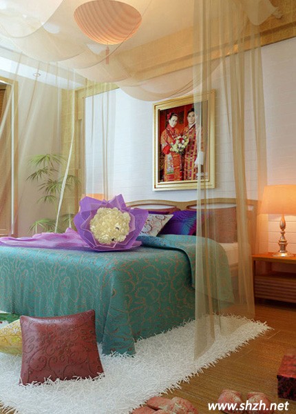 臥室是休息的地方,大紅的顏色不利于睡眠,所以裝修時以喜慶但不過分**的色彩搭配為主。背景墻以白色作為基調,清新淡雅,自然舒暢。淡黃色的床幔透露出浪漫的氣息,隱約可見床上的風景,讓身處其中的女主人也蒙上神秘的氣息,不得不令人浮想聯(lián)翩。作為婚房當然也要有必須的喜慶,所以床鋪顏色的選擇就要與墻面的白色有鮮明的對比,不然就會過于平淡,不利于保持愛情的新鮮。床鋪用紫色與藍色的搭配,色彩分明絢麗,同時藍色象征愛情的忠貞,紫色是浪漫的最佳之選,既絢麗奪目,又有著美好的寓意,每天清晨醒來多可以給我們帶來美好的心情。
