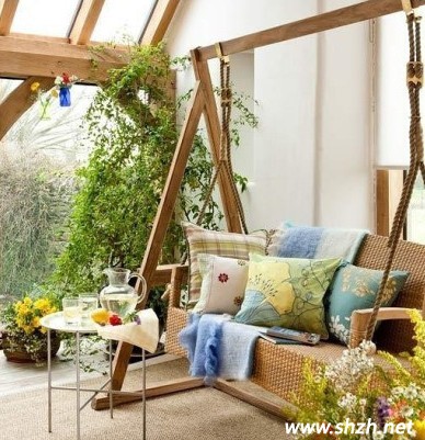 用木板搭制而成的架子,可以懸掛著搖椅,休閑之余還能品品茶,看看各類書刊雜志,再欣賞春天的美景,一切都是多么的愜意。綠油油的樹藤一個(gè)勁的沿著木桿往上爬,春天活躍動(dòng)感的氣氛立即呈現(xiàn)在我們面前。地上在擺放些鮮花綠草,整個(gè)春的氣息撲面而來,使整個(gè)家居更生動(dòng)活潑。