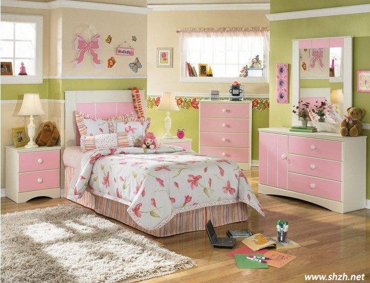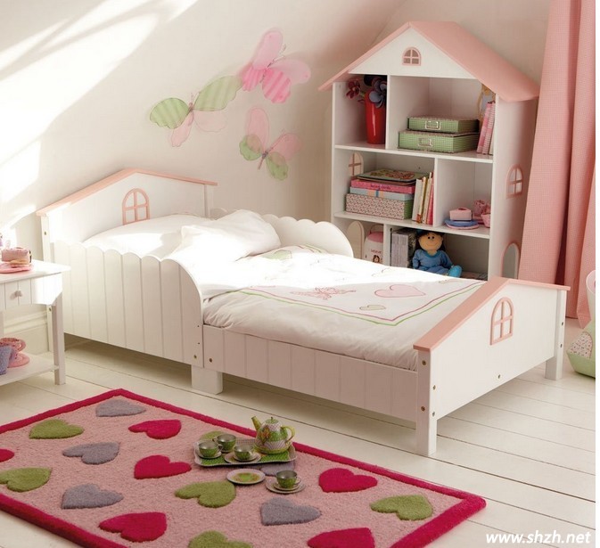 粉紅色始終是女孩子們的最愛,粉紅色布藝家具給兒童房營造了唯美浪漫的氣氛,粉紅色屬于暖色調(diào),有利于培養(yǎng)孩子善良溫厚的性格。床邊鋪設(shè)的地毯也是別有風(fēng)味,上面紅綠兩種顏色的心形突出小女孩的愛浪漫的心理,白色的田園風(fēng)格的床讓孩子在睡夢中也會身處于美麗的大自然,擁有好的睡眠。