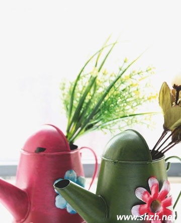 五、家中澆花使用的水壺給人看起來(lái)感覺冰冰涼涼的,那么,就為它也穿上花衣裳吧!用薄的鐵片制作成花的形狀,再粘上去,立體的效果即刻顯現(xiàn)出來(lái)了。