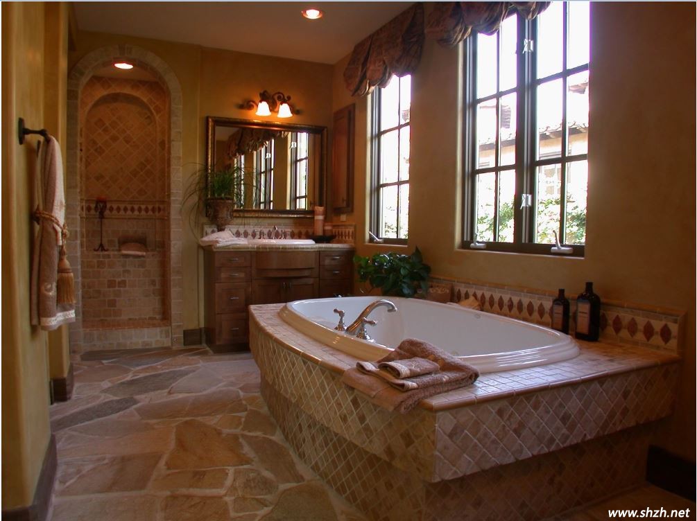 拱形門的裝飾,一下子把西班牙傳統(tǒng)的設(shè)計風(fēng)格帶了進(jìn)來。大量采用了馬賽克的元素,,馬賽克是西班牙風(fēng)與地中海風(fēng)裝修的寵兒。這個衛(wèi)生間空間并不算很大,但透過玻璃窗自然的光線一樣能夠覆蓋這個空間。