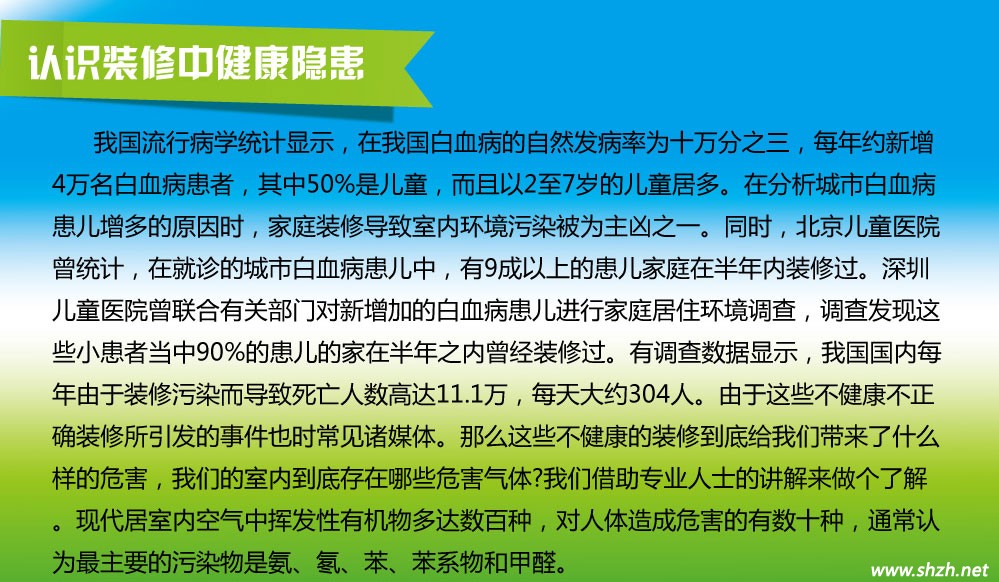 概要: 據(jù)瀟湘晨報長沙訊,一年前,長沙江先生4歲的女兒患上白血病。最近,江先生自己也被確診患有白血病。父女倆先后住進省人民醫(yī)院,醫(yī)生的一句“最近家里有沒有裝修”的提問,讓江先生對自家的空氣質(zhì)量產(chǎn)生了懷疑。 家里沒有白血病遺傳史,為什么父女倆會先后患上白血???江先生百思不得其解。醫(yī)生在詢問病史時,一句“最近家里有沒有裝修”的提問引起了江先生的注意,不過,“我們的房子裝修8年多了,難道還有問題?”