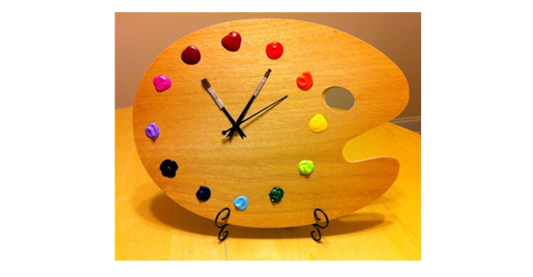 非常簡單的一款設(shè)計(jì),采用實(shí)木打造的鐘盤,上面用彩色作為染料,筆刷為指針,很有創(chuàng)意且趣味十足。可以將它掛在兒童房間里,給孩子生活的環(huán)境增添一份樂趣。