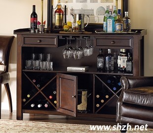 吧臺酒柜一直是西方國家所鐘情的。隨著生活質量的提高,東西方文化的不斷交融,現(xiàn)代的很多年輕人也迷戀吧臺。吧臺無形中成為了人們釋放壓力、舒緩壓力最佳的地方。而吧臺少不了酒柜的襯托。這款美式風格酒柜采用實木框架,板木結合,實木貼皮的方式制作??纱娣啪破俊⒕票€有一些裝飾物,儲存量大。很古樸的一款酒柜。