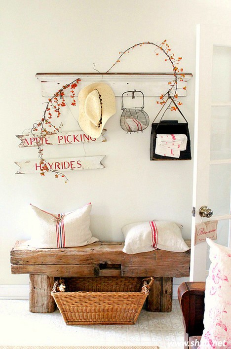實(shí)木的板凳帶來(lái)一種質(zhì)樸的美感,編制的小筐子可以放置常用的小物件,十分精美且又實(shí)用。使用舊的木板做成的掛鉤更具有歷史的滄桑感。