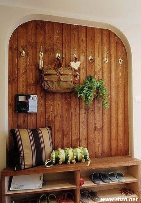 這款設(shè)計(jì),有沒(méi)有給你一種返璞歸真的感覺(jué)?整個(gè)玄關(guān),充滿著大自然的清新。木質(zhì)打造的鞋柜,隨意的擺放常穿的拖鞋。純木質(zhì)制作的背景墻,釘上掛鉤,配合著綠色的吊蘭,鄉(xiāng)村氣息十分濃厚。