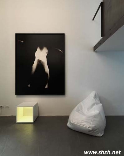 順著一樓的白色樓梯,簡短的上行后,我們來帶了這個(gè)LOFT的二樓。二樓因?yàn)橐尦鰞蓚€(gè)樓梯的空間,所以剩下的空間被隔成一個(gè)“L”型,第一個(gè)樓梯的盡頭處就是這個(gè)小客廳了,沒有繁雜的裝修,簡單的沙發(fā)、電視與榻榻米飄窗構(gòu)成了一個(gè)時(shí)尚個(gè)性的會(huì)客空間。走過客廳,轉(zhuǎn)身來到一個(gè)簡易的工作區(qū)域,為了與一樓呼應(yīng),設(shè)計(jì)師干脆把工作臺(tái)也設(shè)計(jì)成吧臺(tái)的造型,讓你隨時(shí)享受吧臺(tái)樂趣。銜接客廳與工作區(qū)的過道處,一幅抽象畫點(diǎn)亮了單調(diào)的白色墻壁。
