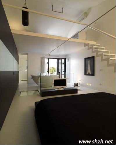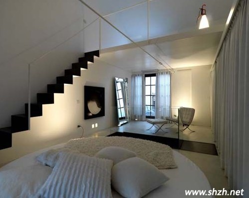 三樓臥室圓床邊的樓梯通向四樓,圖四中的第一幅圖可以看見四樓的全景,左側(cè)是一個(gè)巨大的浴缸,讓你享受沐浴的快樂,右側(cè)也是一個(gè)臥室的設(shè)計(jì),整棟LOFT的風(fēng)格都是極致簡約。四樓中還有一個(gè)樓梯,小編這里就不為大家展現(xiàn)五樓的風(fēng)景了,由大家去想象吧!