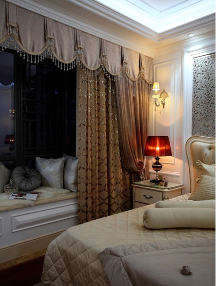 凸窗臺也可有很好的利用價值;暗紅的臺燈增加了臥室的情調;