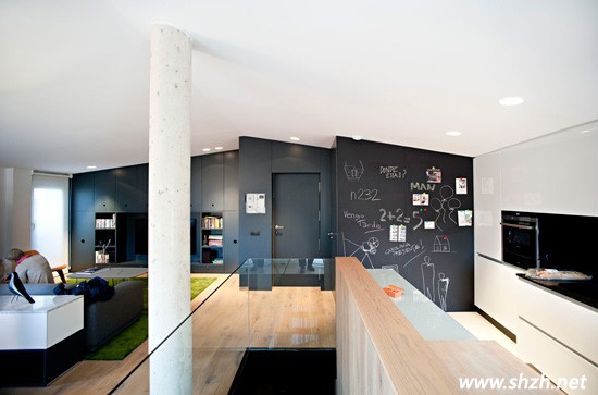 黑白為主色調(diào)的客廳空間,一點(diǎn)也不顯得枯燥乏味,莊重而典雅的感覺(jué)。而且前面的設(shè)計(jì),設(shè)計(jì)師考慮到空間的單調(diào)性,特地制作了墻面彩繪,可以在上面隨意的寫(xiě)字畫(huà)畫(huà),比如可以記錄下今天的生活心情或者工作內(nèi)容,亦或者教小孩讀書(shū)寫(xiě)字,讓單調(diào)的空間瞬時(shí)變得活力十足,生動(dòng)而有趣。而且,也正好是這樣才會(huì)的方式,巧妙的將客廳廚房鏈接了起來(lái),自然的過(guò)渡,創(chuàng)意十足。