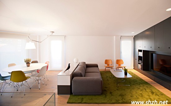 再來(lái)細(xì)看客廳的布局,一塊綠色的地毯就足以將客廳與餐廳嚴(yán)格區(qū)分了開(kāi)來(lái),非常巧妙的鋪設(shè),而且色彩的選擇上也恰到好處,不會(huì)顯得特別的生硬?;疑纳嘲l(fā),似乎略顯單調(diào),但是,如果用吧臺(tái)作為沙發(fā)背景墻,那就有趣多了,不僅可以作為隔斷,休閑之余,還能在此喝茶聊天,或者與愛(ài)人一同品酒,是那樣的充滿樂(lè)趣。
