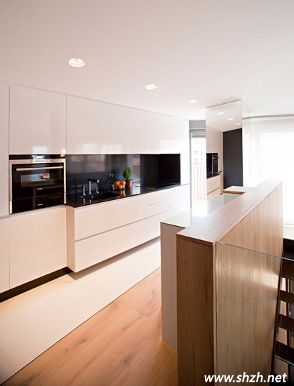 廚房的設(shè)計(jì)很簡(jiǎn)約,黑白兩色的經(jīng)典搭配構(gòu)成了整體的櫥柜,很有現(xiàn)代的氣息。雖然簡(jiǎn)約,卻不簡(jiǎn)單,嵌入式櫥柜的電子爐設(shè)計(jì),每個(gè)細(xì)節(jié)都體現(xiàn)了科技化的家居氛圍。不簡(jiǎn)單之處不止這些,我們看到另一面的櫥柜與樓梯巧妙的融合在一起,多種功能合一,創(chuàng)意無(wú)限。