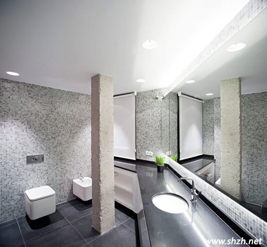 衛(wèi)生間也巧妙的運(yùn)用了水泥柱,將衛(wèi)浴空間干濕分離,而鏡子本身就具有擴(kuò)大室內(nèi)空間的作用。設(shè)計(jì)師在衛(wèi)浴間巧妙的采用了大面積的鏡子,使得小型的衛(wèi)浴視覺(jué)上變得更加的寬敞明亮。