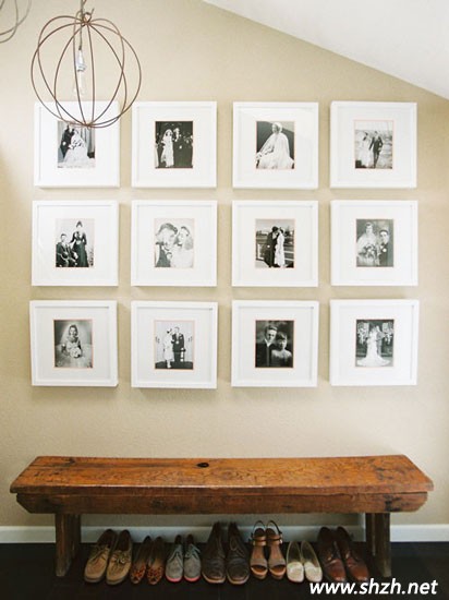 黑白照片,仿佛將時光拉回到五六十年代,一下子加重了整體的時代厚重感。純白色的方形相框,分三排,每排四個,整齊的懸掛上老夫妻年輕時的各種甜蜜瞬間,結婚時的婚紗照,生活中的甜蜜照,外出旅游時的幸福瞬間,記錄著老夫妻生活的甜蜜。原木色彩的長方形椅子,斑駁的印記,更加重了整體的時代感。長椅下面整齊的擺放上一雙雙鞋子,一步步記錄著老夫妻的生活,是愛情,讓他們堅定的走在一起,幸福的生活著。