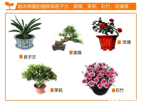 君子蘭、紫薇、茉莉、檸檬等植物,5分鐘內(nèi)就可以殺死白喉菌和痢疾菌等原生菌。薔薇、石竹、鈴蘭、紫羅蘭、玫瑰、桂花等植物散發(fā)的香味對(duì)結(jié)核桿菌、肺炎球菌、葡萄球菌的生長繁殖具有明顯的抑制作用。玫瑰、桂花、紫羅蘭、茉莉、檸檬、薔薇、石竹、鈴蘭、紫薇等芳香花卉產(chǎn)生的揮發(fā)性油類具有顯著的殺菌作用。