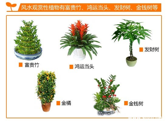 富貴竹、鴻運(yùn)當(dāng)頭、蓬萊松、七葉蓮、發(fā)財(cái)樹、金錢樹、招財(cái)樹、君子蘭、蘭花、仙客來、桔等植物因?yàn)槠涿Q蘊(yùn)含吉祥如意、恭喜發(fā)財(cái)?shù)脑⒁猓H受人們歡迎,被當(dāng)做家居風(fēng)水的裝飾???。