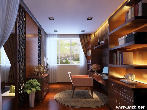 開放式書房在小戶型的空間里同時(shí)也具有很大的裝飾效果,但干擾較大,因此會(huì)降低工作效率。所以我們就需要注意在用書櫥或用柜子、布幔等將空間隔開的同時(shí),還要保證書房的隔音效果。地面應(yīng)選用木地板或地毯等材料,來降低地面的傳感音效。而墻面的用材最好用壁紙、板材等吸音較好的材料,以取得書房寧靜的效果。如果用布幔來進(jìn)行隔斷,布幔的材質(zhì)最好選用既能遮光又具通透感的淺色紗簾比較合適。