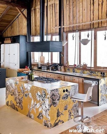 廚房中,櫥柜采用的是一字型的排列方式,其上鋪貼的黃色花紋型馬賽克給整個(gè)木系別墅都增添上了一層藝術(shù)氣息。黑色的抽油煙機(jī)深沉內(nèi)斂。另外櫥柜和收納柜被統(tǒng)一安置在了房間的伽羅里,這樣在節(jié)省了空間的同時(shí)也省去了讓空間凌亂的麻煩。