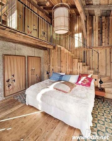 臥室被別出心裁的安排在了樓梯旁邊。白色毛絨絨的床上用品讓人一看就有躺上去的沖動(dòng)。大大的吊燈溫暖著整個(gè)空間。