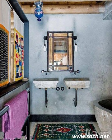 衛(wèi)浴間沒有繼續(xù)使用實(shí)木的材質(zhì),而是在吊燈上保留原木的同時(shí)使用了水泥的墻面,但是完**露的墻面以及顏色鮮艷的地毯都將整個(gè)空間渲染的個(gè)性十足。