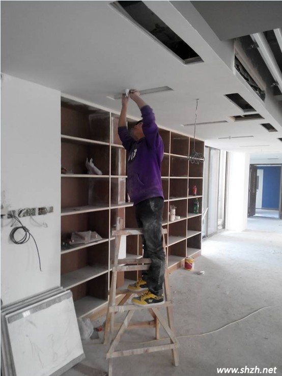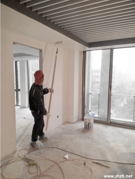 今天進(jìn)行到內(nèi)墻、吊頂刮膩?zhàn)?,滾涂涂料的階段。走進(jìn)辦公室大廳靠窗的位置,師傅正在用乳膠漆對(duì)該處的吊頂進(jìn)行滾涂作業(yè)。